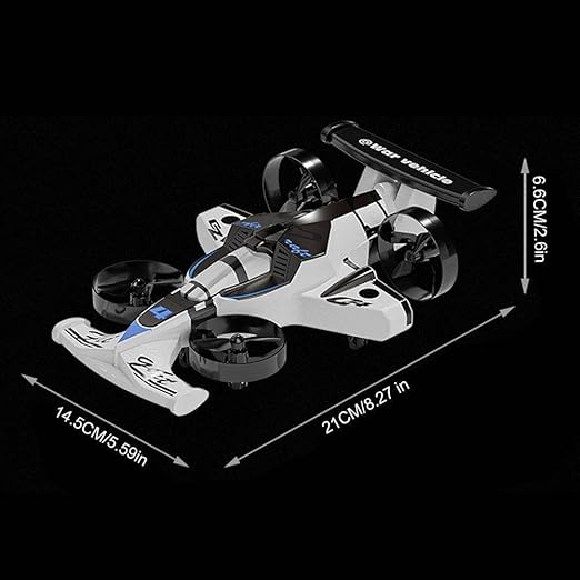 Take your playtime to thrilling new heights with this incredible 2-in-1 RC War Vehicle that doubles as both a flying drone and a ground racing car! Styled like a futuristic Formula 1 fighter jet, this remote-controlled toy features four powerful rotors encased in protective guards, giving it a bold and aggressive look that kids and hobbyists will absolutely love. Switch seamlessly between air and ground modes — soar through the skies like a drone or race across the floor with its cool drift mode, letting you experience the excitement of racing-level drifting right in your living room or outdoors. The ergonomic remote controller offers precise and responsive handling, making it easy to perform sharp turns, spins, and aerial manoeuvres. Its striking white, black, and blue colour scheme adds to its sporty, high-performance appeal. Whether you are a beginner or an experienced RC enthusiast, this versatile war vehicle delivers non-stop action and adventure. Makes for an excellent gift for children and teens who love remote-controlled toys.