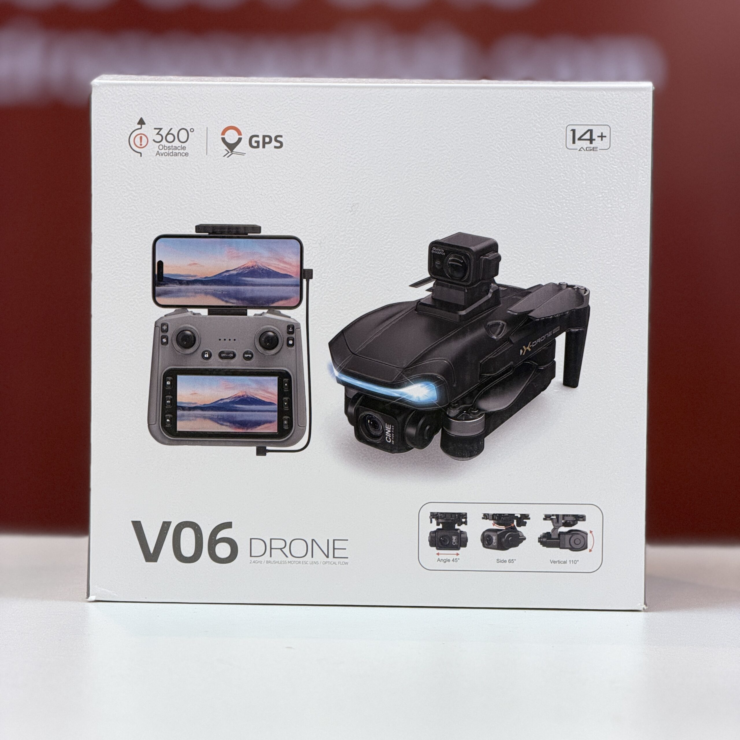 📦 BOX CONTENTS: • V06 Drone • Display Remote Controller • 2x Batteries • Propellers, Charging Cable & accessories •OAS sensor *User Manual* Paperwork